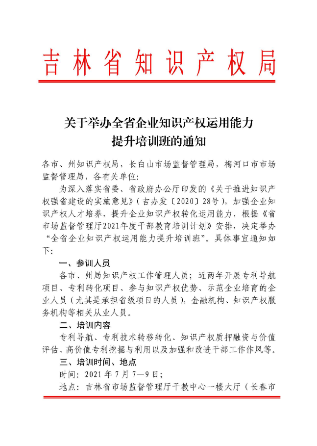 吉林省知識(shí)產(chǎn)權(quán)局:關(guān)于舉辦全省企業(yè)知識(shí)產(chǎn)權(quán)運(yùn)用能力 提升培訓(xùn)班的通知